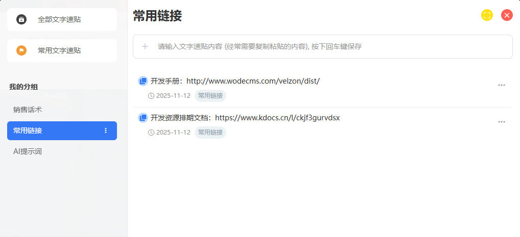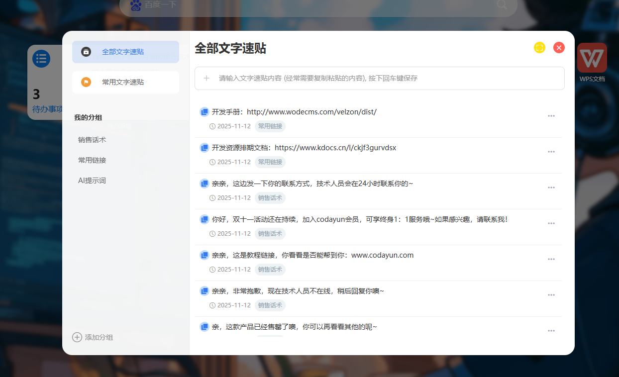 你每天是不是都在反复复制客户信息、会议链接、账号密码? 这款工具是内置于CodaYun云端系统里面的,打开(www.codayun.com)后,在底部应用台中点击【粘贴板工具】,就可以直接上手使用。 1、如果你是做销售的,那么你可以把这里当成你的话术保存工具。客户问价格、要方案、提疑问,你都可以提前整理好各类话术,用到的时候一键复制,直接发送。 工具链接直达:CodaYun